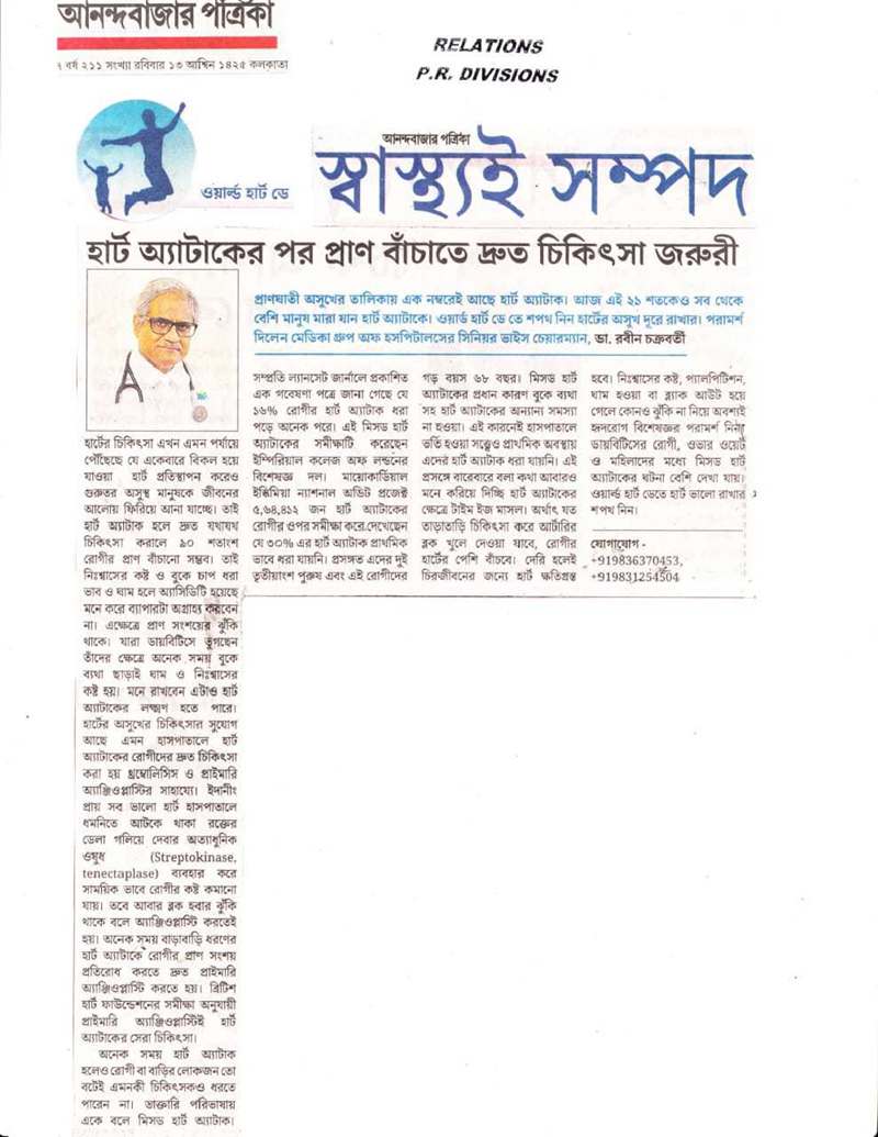 He is one of the top Cardiologist in the country. He had been a topper throughout his career. He did M.B.B.S (Honours) from Calcutta University, and was the best graduate of the year. He is a M.D. (Medicine) from the PGIMER, Chandigarh, a National Premier Institute for Postgraduate Medical Education in India and DM in Cardiology from PGIMER, Chandigarh, India. Dr. Chakraborty has received several gold medals and prizes in his career. He has Diplomat of National Board (DNB) National Board, Delhi, India. He has qualified in host of foreign degrees like F.R.C.P.– Royal College of Physicians, London, F.R.C.P – Royal College of Physicians and Surgeons, Glasgow, UK and F.R.C.P – Royal College of Physicians, Dublin, Ireland.